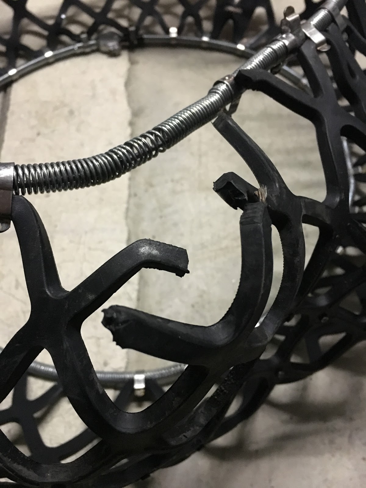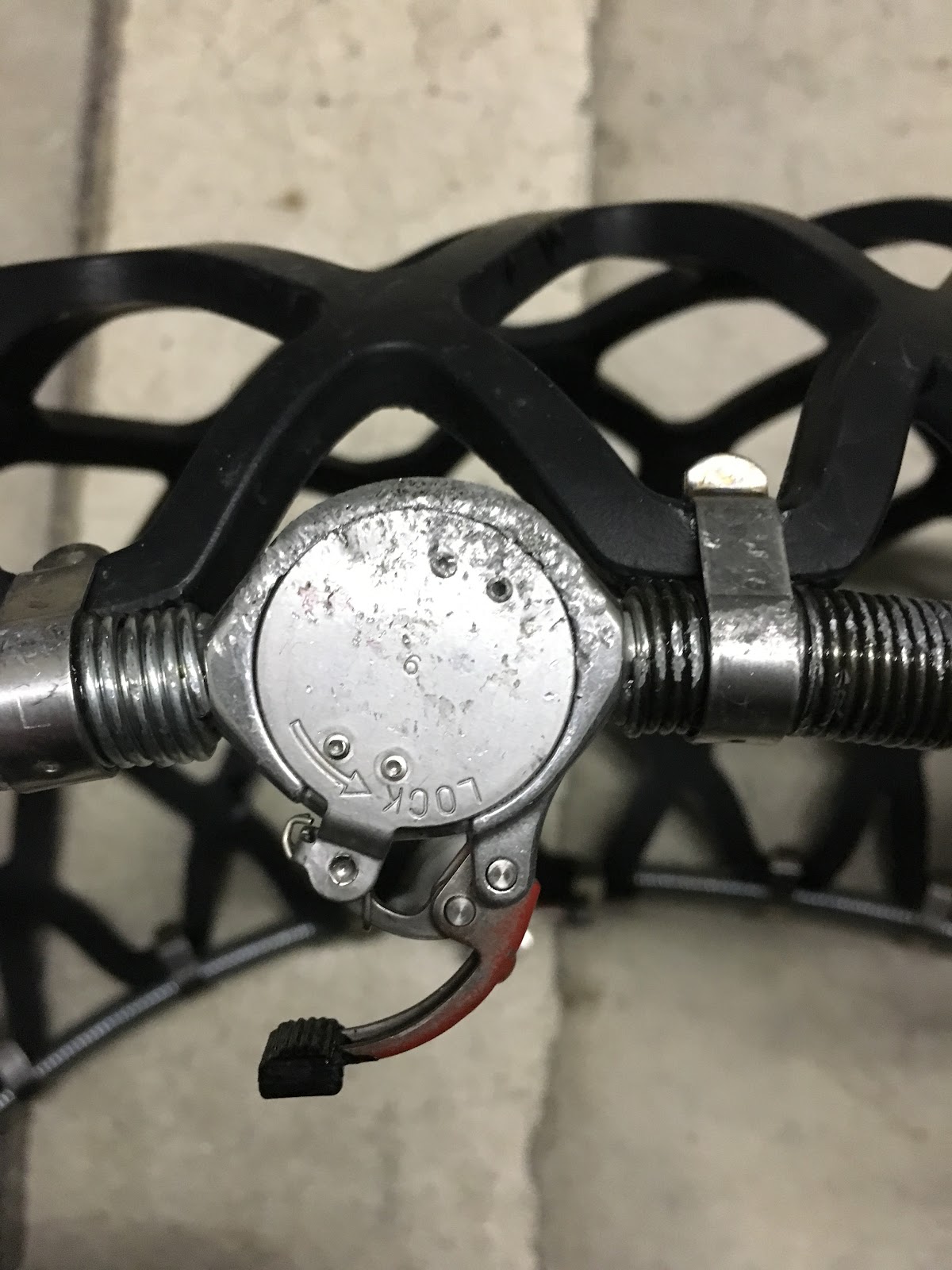 なんと、ロックが破損して動かなくなってしまいました。途中ガタガタと異音がするので降りてみたら、内側に食い込んで破損していました。 でもでも、イエティスノーネットは何も悪くないんです・・・。そう、私のつけ方が悪かったんです。 必死で1時間程度取り出そうと、もがきましたが、取れません。どうも車でロックを何度も引いてしまいロックが緩まなくなってしまったようです。結局ジャッキに頼り、タイヤを外してイエティスノーネットを外すことになりました。 実はイエティスノーネットは雑につけると自動で補正はされないようです。微調整はされますが結構正確につけないとダメです。説明書には一定距離走行して確かめるように書いてあります。私の場合は走行距離が短くその時点でOKと判断しましたが、その後ずれたようです。