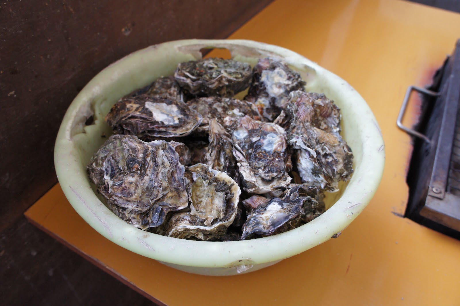 カキは1洗面器?1ざると呼ぼうか、なくなったら横に積み上げてるので取りに行く形式です。なんか雑多に積み上げているので「中身スカスカのカキじゃないのか?」と疑ってしまいます。