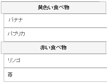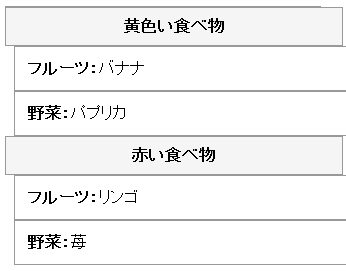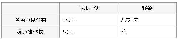 <table class="tbl_content"> <thead> <tr> <th></th> <th>フルーツ</th> <th>野菜</th> </tr> </thead> <tbody> <tr> <th>黄色い食べ物</th> <td sub1="フルーツ:">バナナ</td> <td sub2="野菜:">パプリカ</td> </tr> <tr> <th>赤い食べ物</th> <td sub1="フルーツ:">リンゴ</td> <td sub2="野菜:">苺</td> </tr> </tbody> </table>