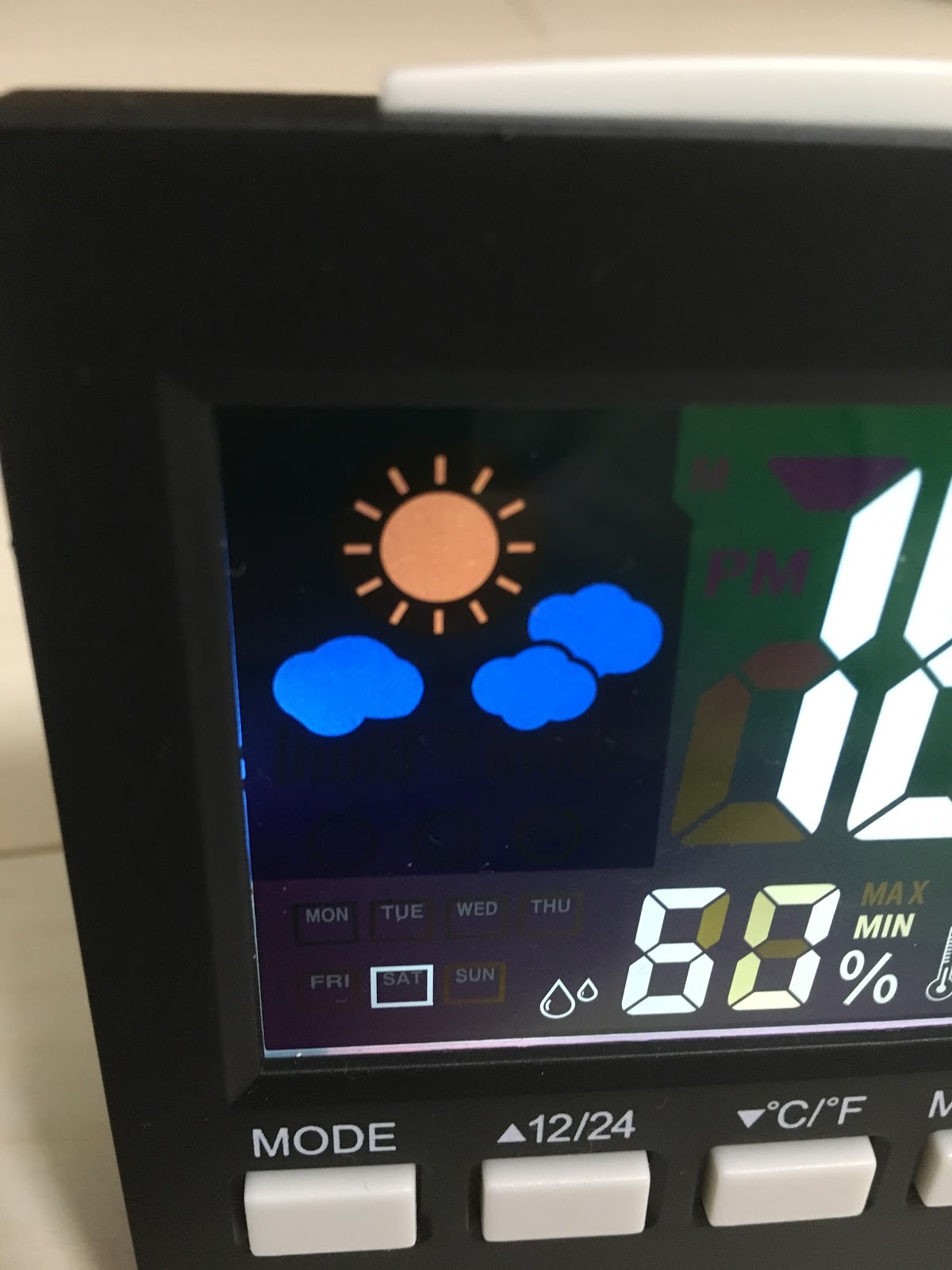 説明書を見てもさらっと、「晴れ、半晴れ、曇り、雨」を表示するとしか書かれていません。もうしばらく置いておくと電波でも拾って適切な天気を表示してくれる気もします。
