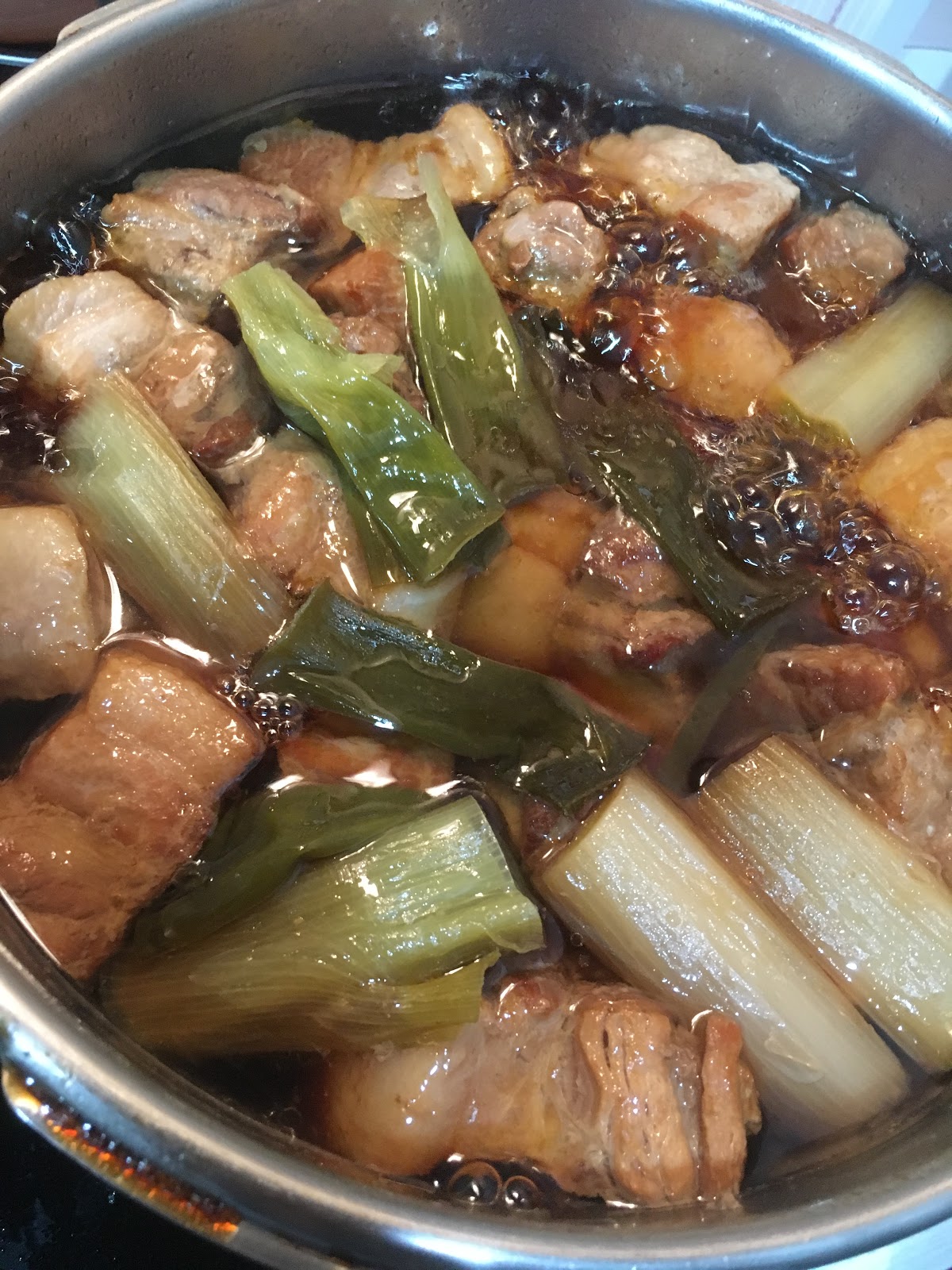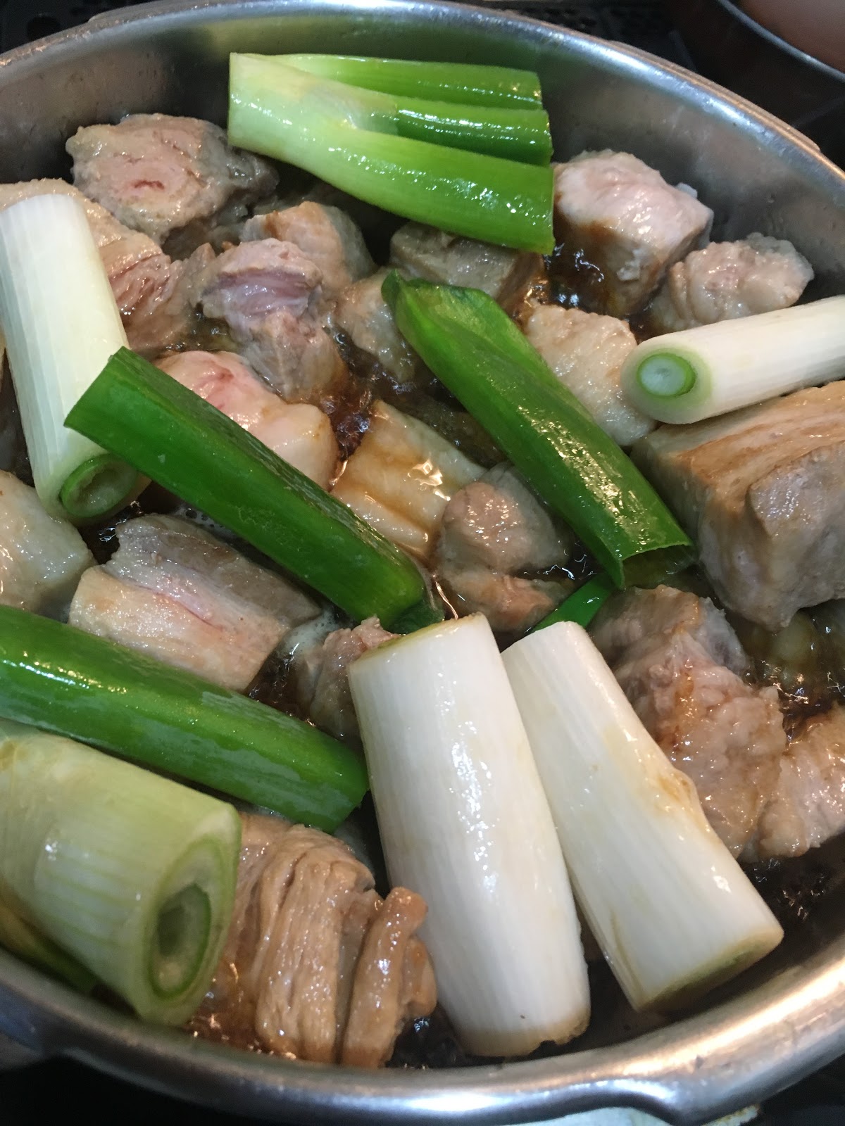 ネギに触ると原型をとどめないぐらいぐちゃっとなります。豚バラ肉もほろほろと繊維に沿って崩れるようになっています。これからもう15分ほどぐつぐつして見込んで味を染み込ませてきましょう。