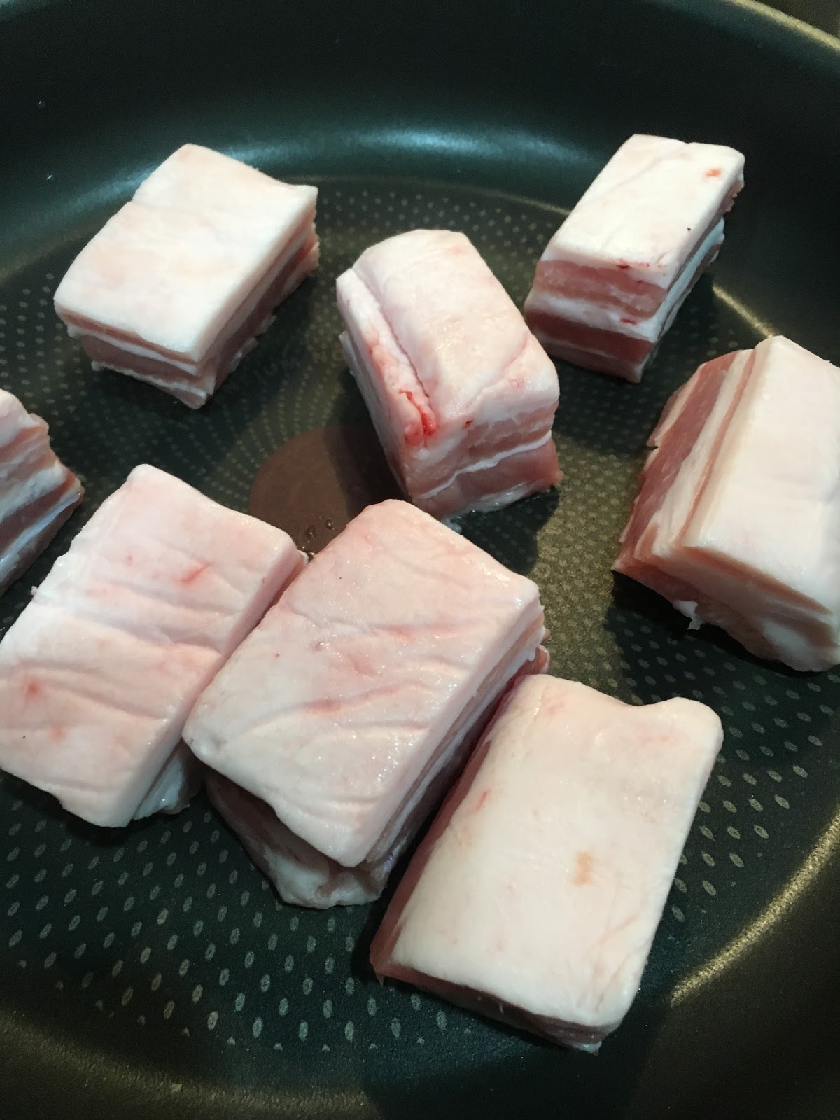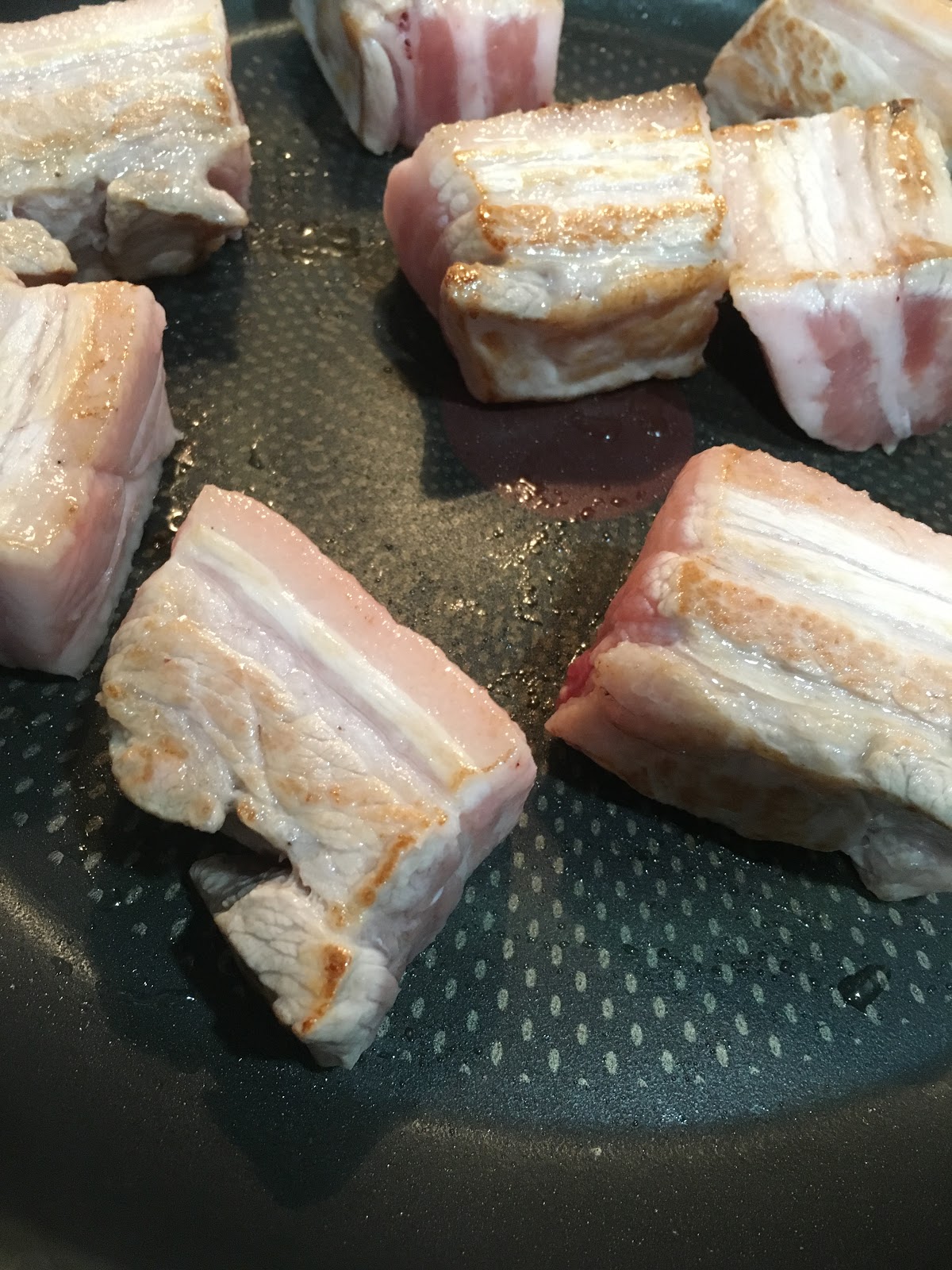 切った豚バラ肉は6面を焼いて煮たときに旨味が逃げないようにします。結構脂が散るのでコンロが油だらけになるので蓋を準備していた方がいいかもしれません。蓋を盾にしてしのいでください!