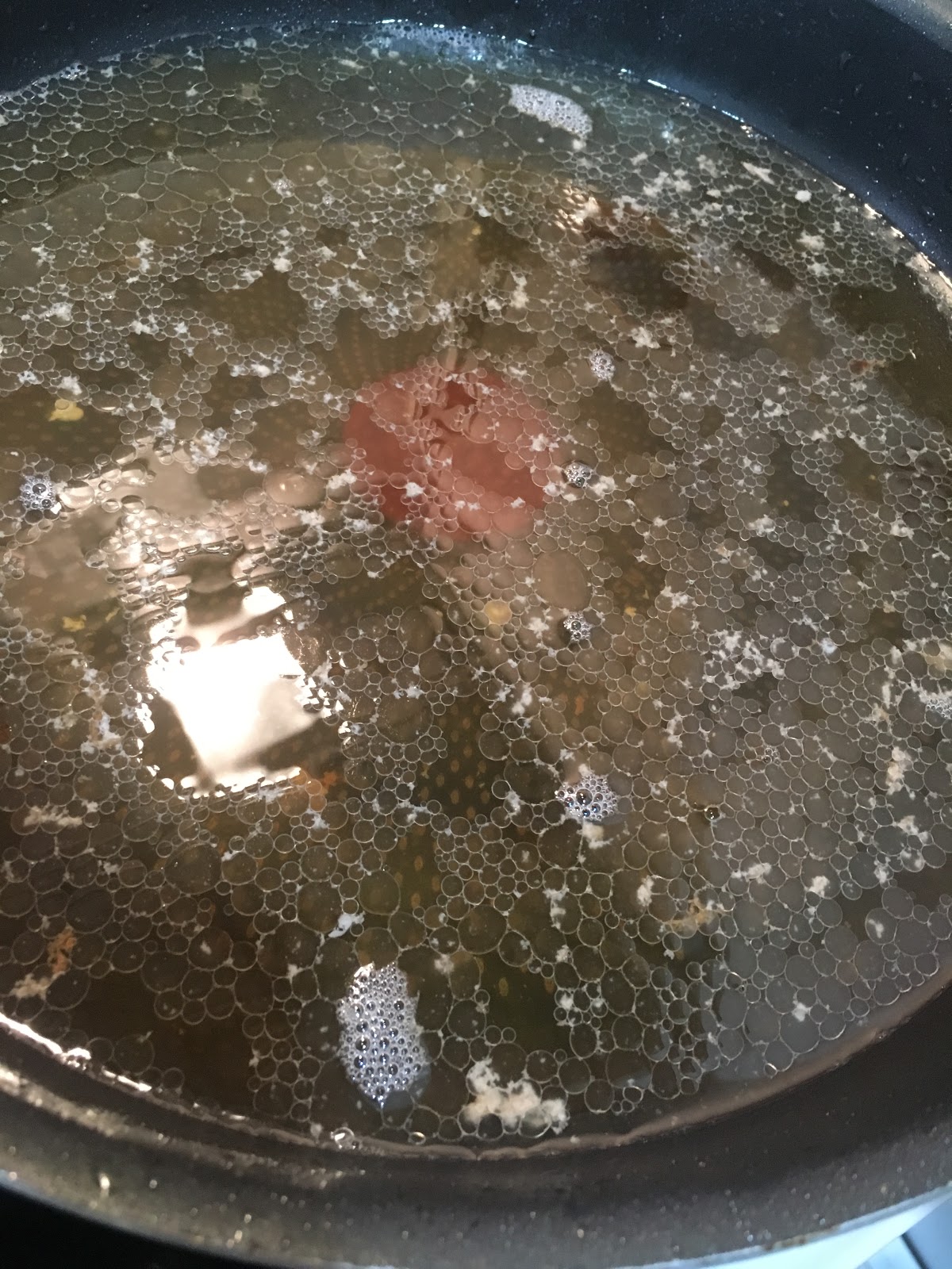 豚バラ肉は最強に脂を含んでいるので少し脂と臭みを抜きます。ひたひたになるぐらいで10分ほど水でぐつぐつします。すさまじい脂です。