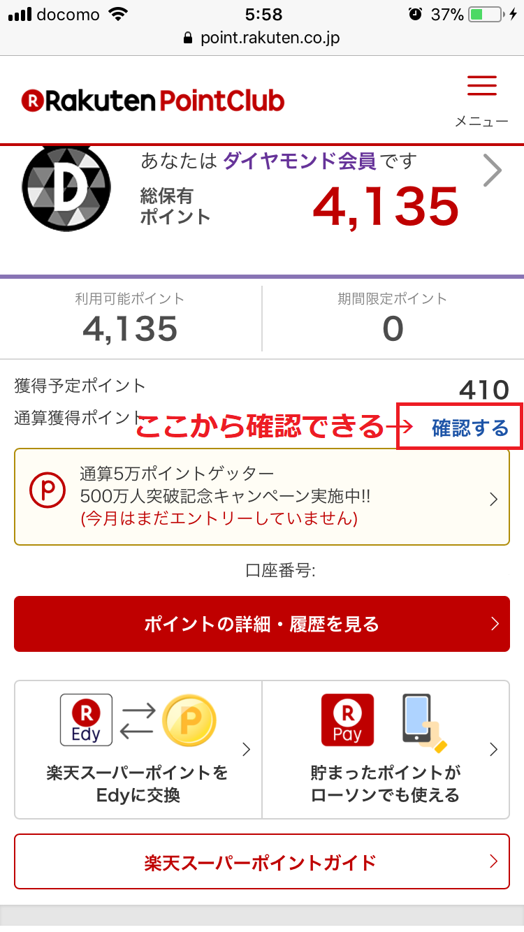 スマホ版の楽天ポイントサービスの画面の「通算獲得ポイント」の右に配置されている「確認する」のリンクから通算獲得ポイントを確認できます。