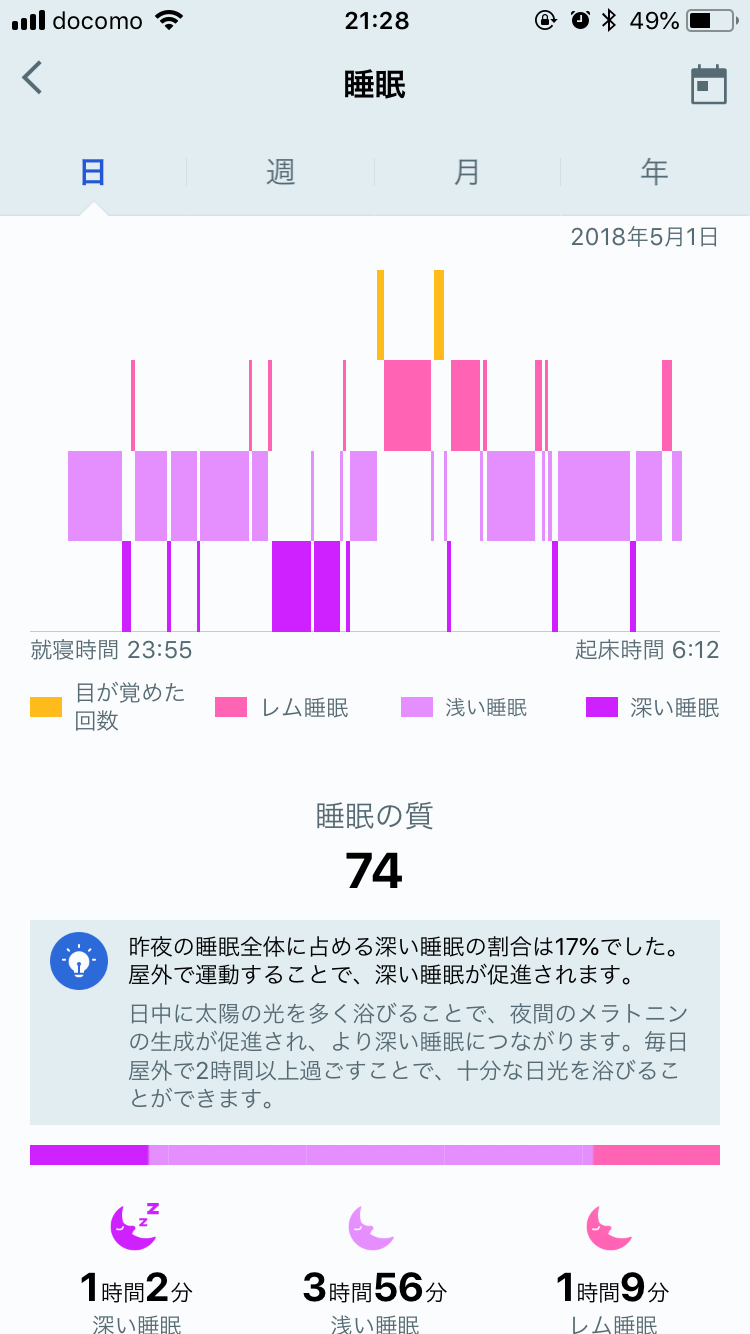 Huawei Band 2 Pro は睡眠をモニタリングして、深い眠り、レム睡眠、起床状態を正確に分析できるそうです。こんな感じで測定できます。結構睡眠の質が悪い・・・。