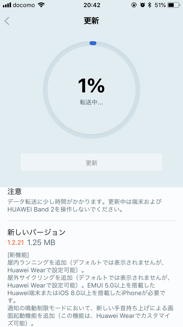 iPhoneアプリとHuawei Band 2 Proをペアリングして、すぐに更新を案内されました。こういったファームアップデートはセキュリティ上重要なので、まずファームアップデート更新をさせるあたり好感が持てます。