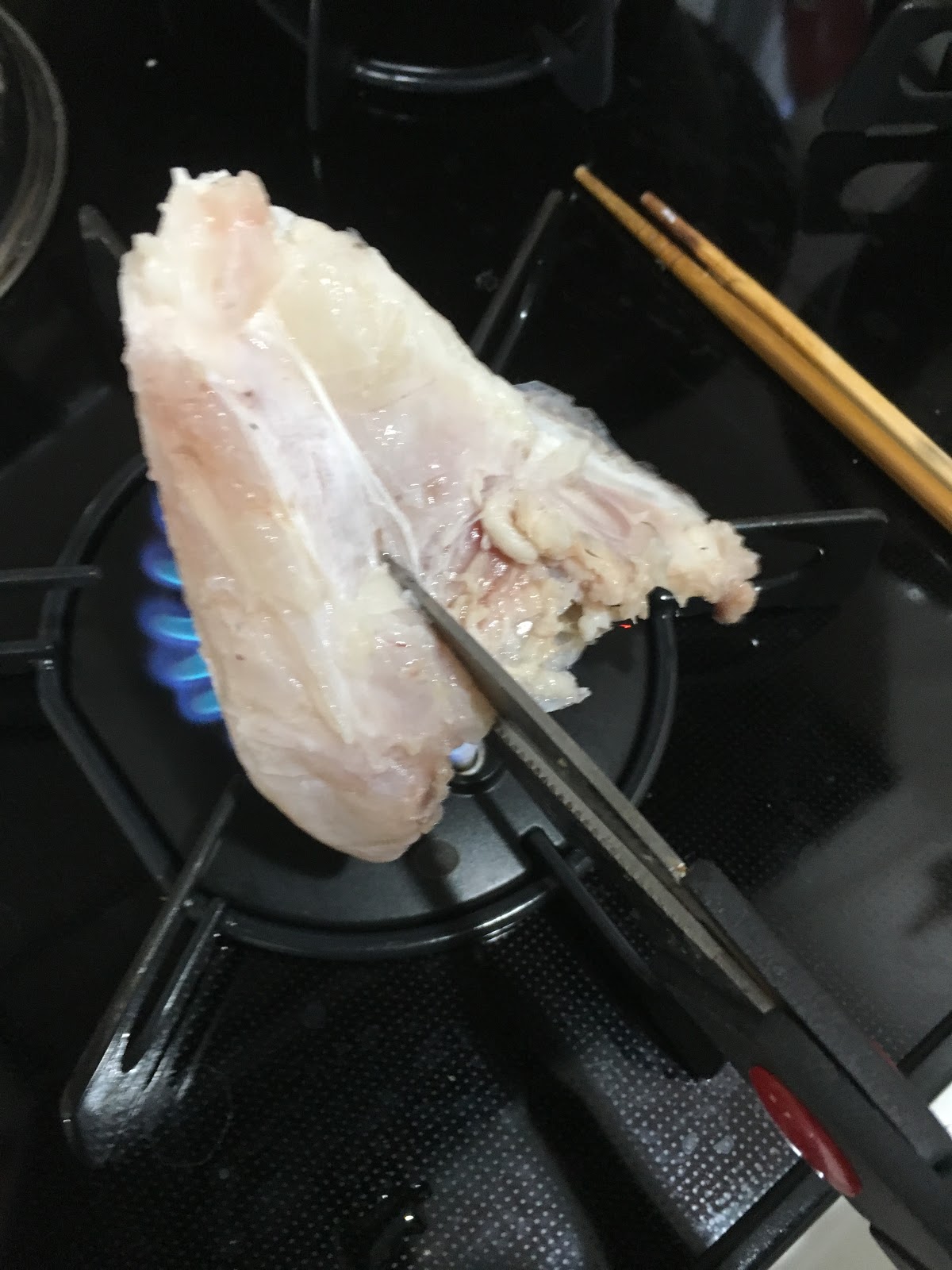 前回は鯛のあらの洗いと熱湯風呂が甘かったので、前回の2倍のお湯を用意しました。そして、今回は臭みを最大限に抑えるためにガスであぶります。