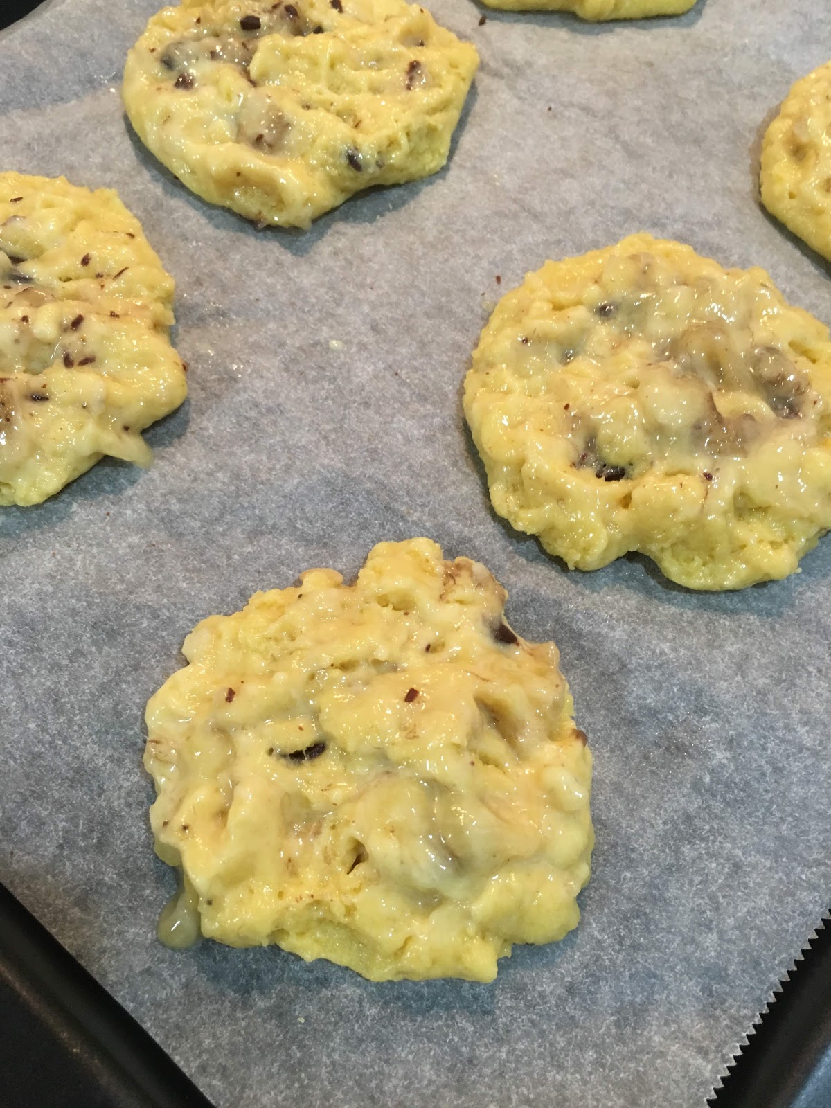 ねっちょり、しっとりしたら形を成形して、クッキングシートを引いた天板の上に乗せます。天板1枚で6個ぐらい置けるので天板は2枚いると思います。天板1枚しかない人は材料は半分量で行きましょう。