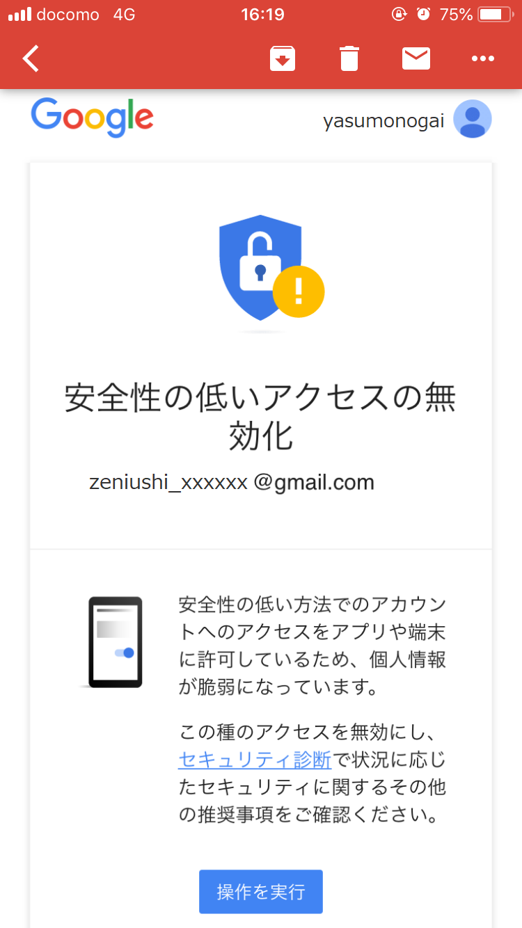 さて、今回送られてきたメールは「安全性の低いアクセスの無効化」しなさいということだそうです。セキュリティ設定の弱い点を教えてくれるなんて親切なメールですね。