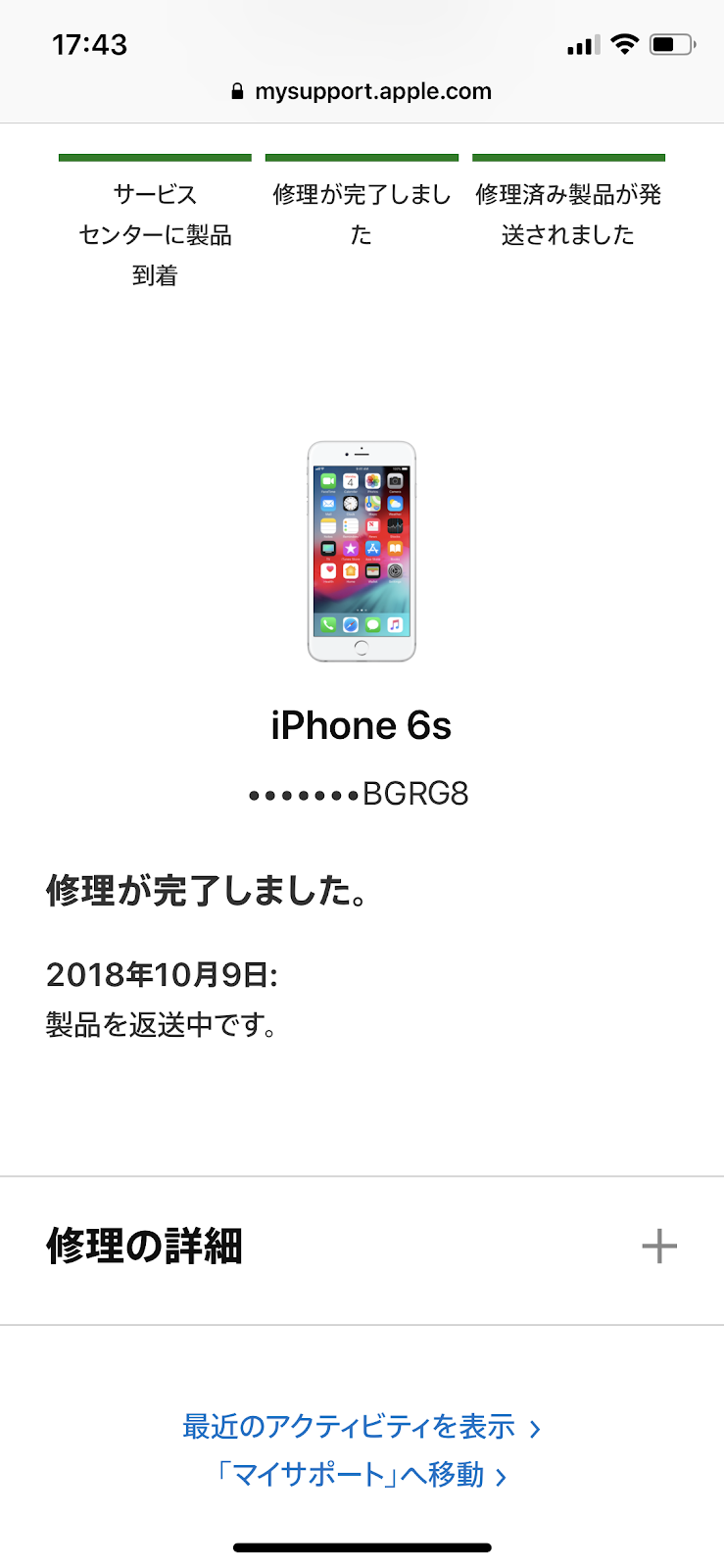ただ、10/2にiPhoneを渡したのですがマイページの修理状況が変わりません。「梱包箱をお届け中です。」のままです・・・。