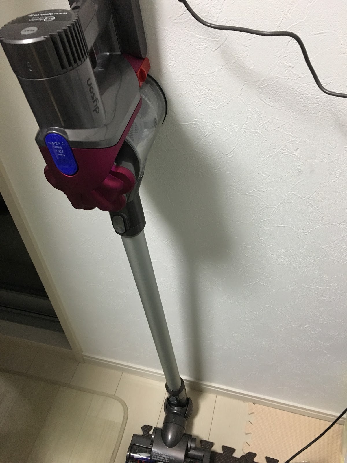 毎日使って重心の場所を覚えれば2秒ぐらいでダイソンコードレス掃除機DC35(Dyson Digital Slim DC35)を自立させることができるんじゃないかと思うんです。そうなると、地面に横置きしたり、わざわざ壁に掛けに行かなくてもよさそうです。家事効率大幅アップ間違いなしですね。